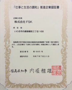 2025年9月29日(月)に福島県いわき地方振興局にて福島県次世代育成支援企業認証書交付式が行われました。
